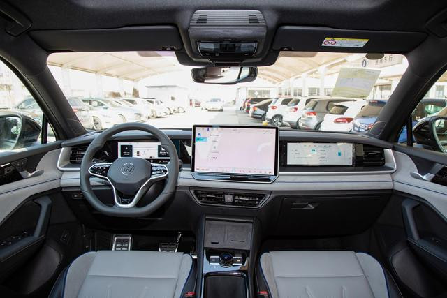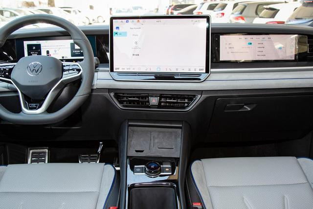 打开车门,坐进全新探岳 L 的车内,一股浓浓的科技感和舒适感扑面而来。首先映入眼帘的是车内配备的三块大屏,内嵌式的液晶仪表显示清晰,信息丰富,能够让驾驶者在驾驶过程中轻松获取各种关键数据,如车速、油耗、行驶里程等,为驾驶者提供了极大的便利。中央大面积的中控大屏操作流畅,界面设计简洁明了,集成了车辆的各种控制功能以及多媒体娱乐系统。驾驶者可以通过中控大屏轻松实现导航、播放音乐、调节车辆设置等操作,为驾驶体验增添了不少乐趣。此外,车内还配备了一块副驾驶娱乐屏,这一设计充分考虑了副驾驶乘客的需求,副驾驶乘客可以通过这块屏幕观看视频、浏览信息等,让旅途不再枯燥乏味。
